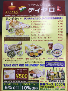 目の前を通ってみると中からは普段から使用しているヒンディー語みたいな言語も聞こえてきますが、ドアから中に入ると普通に日本語で対応してもらえますので安心して中に入れました。もし不安がある場合にはメニューがありますのでその中から欲しい物を指で示せばそのまま作ってくれます。メニューもわざわざ持ってこられましたので今回はワンコインテイクアウトのランチをお願いすることにしました。